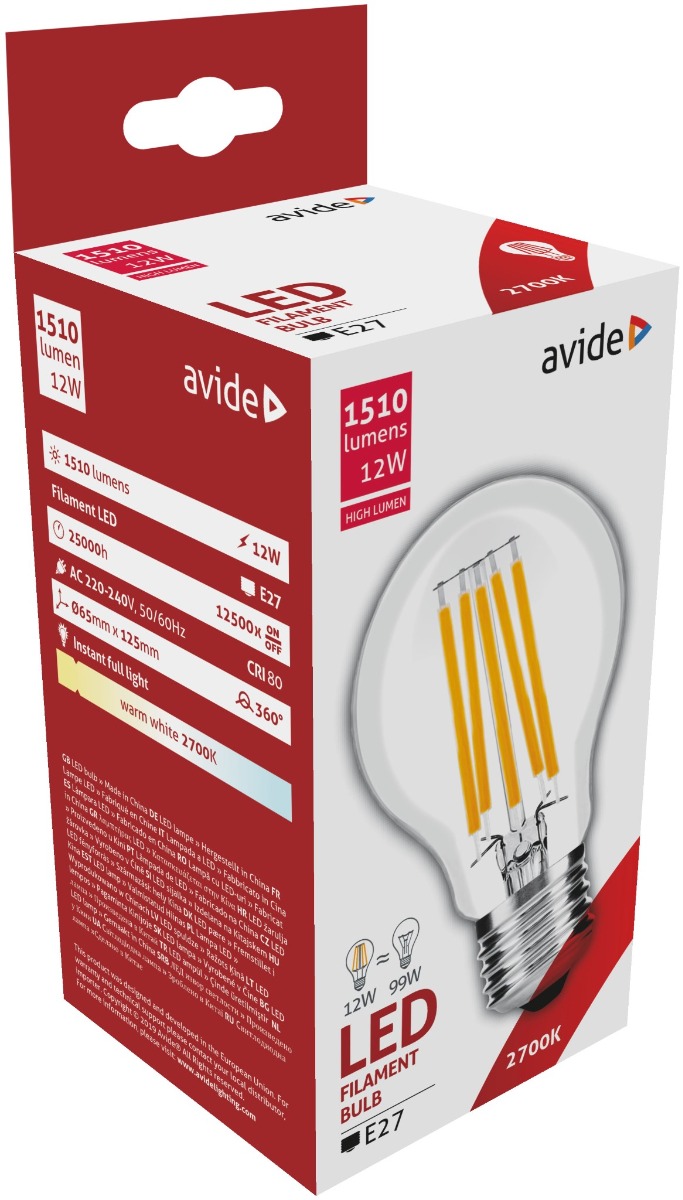 Avide LED Filament Κοινή 12W E27 A65 360° Θερμό 2700K Υψηλής Φωτεινότητας