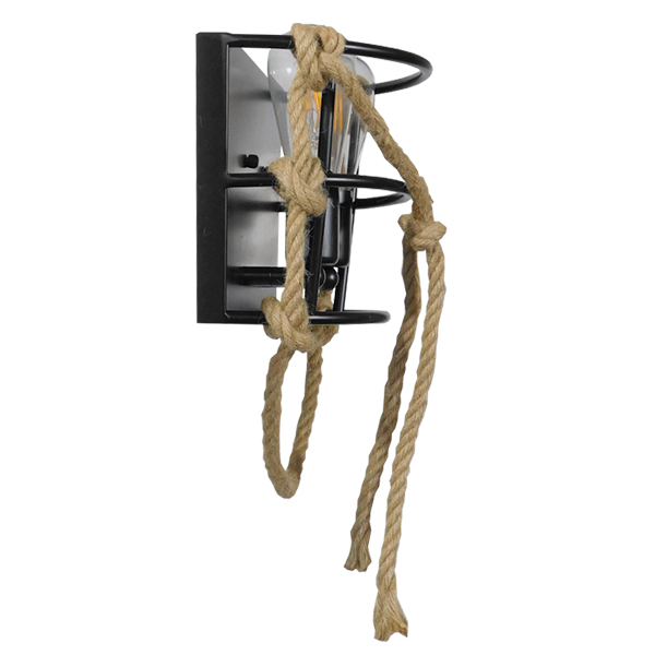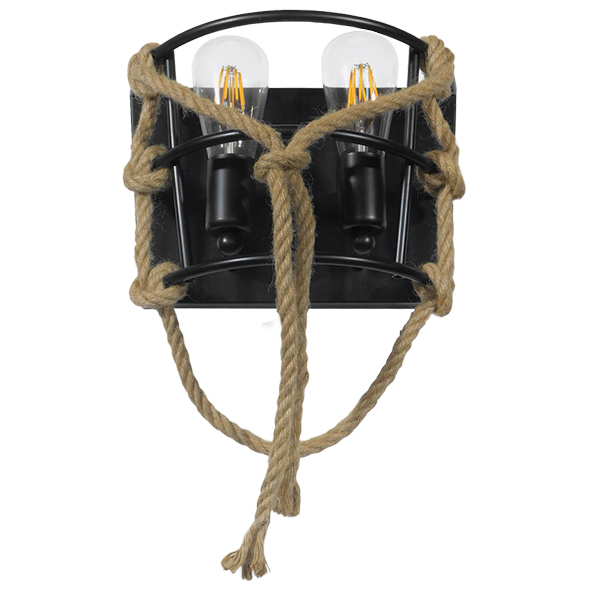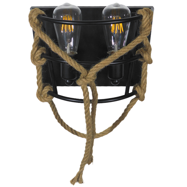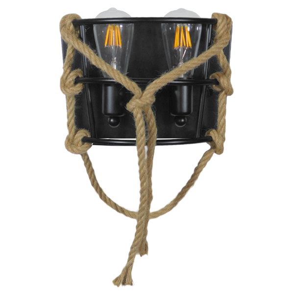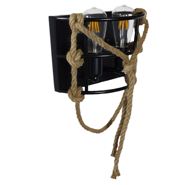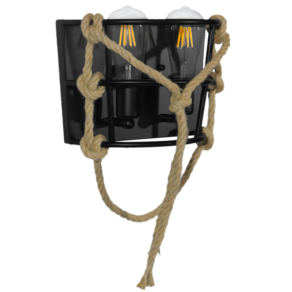 GloboStar® BARBOSA 01083 Vintage Industrial Φωτιστικό Τοίχου Απλίκα Δίφωτο Μαύρο Μεταλλικό Πλέγμα με Μπεζ Σχοινί Μ12 x Π19 x Υ28cm