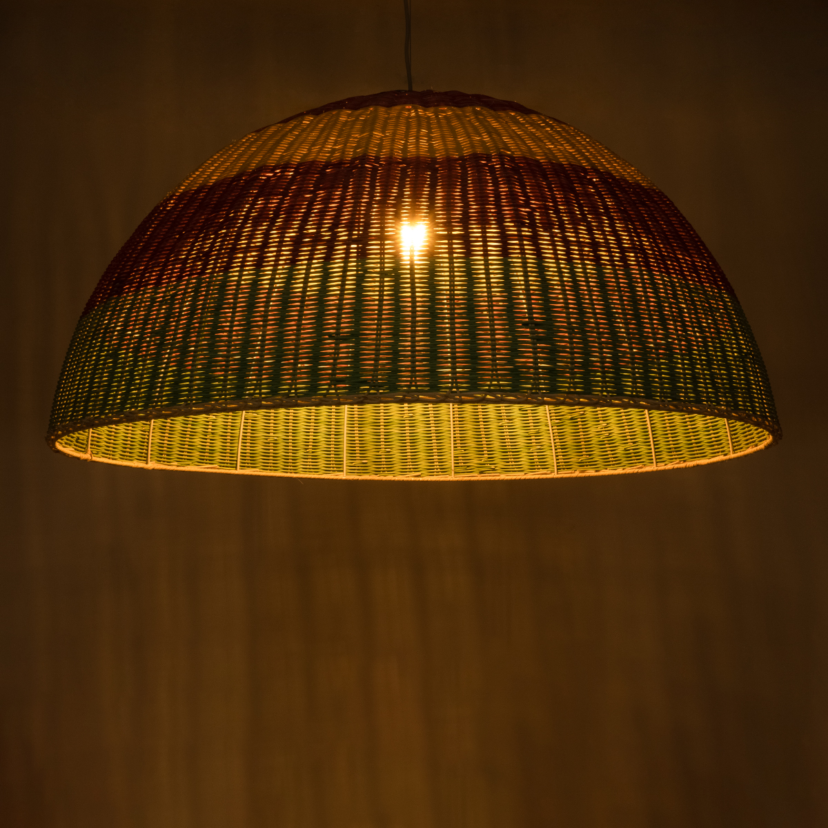 GloboStar® CABALLEROS 02062 Boho Κρεμαστό Φωτιστικό Οροφής Μονόφωτο 1 x E27 AC220-240V IP20 – Φ100 x Υ53cm – Πράσινο με Κίτρινο και Κόκκινο Ξύλινο Μπαμπού Πλέγμα Καμπάνα – 5 Χρόνια Εγγύηση