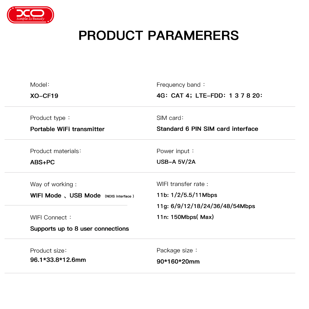 Μοντέλο: XO-CF19Ζώνη συχνότητας: 4G: CAT 4; LTE-FDD: 1 3 7 8 20:Τύπος προϊόντος: Φορητός πομπός WiFiΚάρτα SIM: Τυπική διασύνδεση κάρτας SIM 6 PINΥλικά προϊόντος: ABS+PCΕίσοδος ρεύματος: USB-A 5V/2AΤρόπος λειτουργίας: Λειτουργία WIFI, Λειτουργία USB (διεπαφή NDIS)WIFI Connect : Υποστηρίζει έως και 8 συνδέσεις χρηστώνΜέγεθος προϊόντος: 96,1*33,8*12,6mmΡυθμός μεταφοράς WIFI: 11b: 1/2/5,5/11 Mbps11g: 6/9/12/18/24/36/48/54Mbps 11n: 150Mbps (Μέγ.)Μέγεθος συσκευασίας: 90*160*20mm