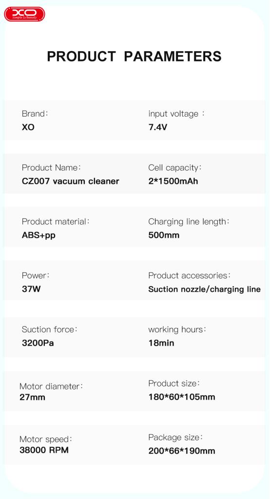 Vacuum degree: 3.2 KpaProduct noise: ≤ 80 db (A)Filtering method: Haipa filter screenDust collection method: dust cupDust collection capacity: 0.4 LBattery type: Lithium batteryInput voltage/current: DC5V/2ACharging time: 2-3 hoursRated voltage: 7.4V (18650 * 2 * 1500mAh)Rated power: 37 WDischarge time: approximately 18 minutesProduct material: ABS+PP