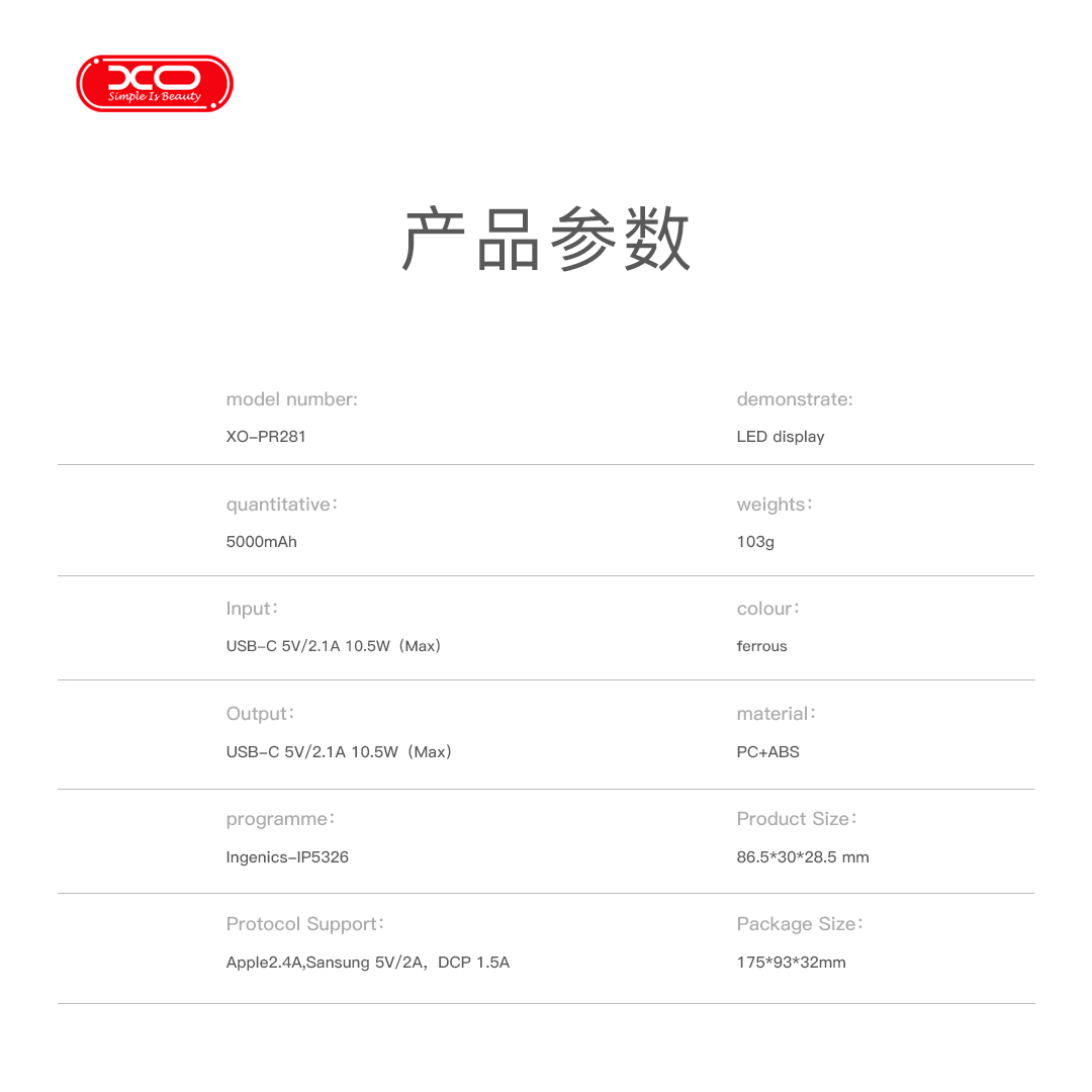 Χωρητικότητα: 5000mAhΟνομαστική χωρητικότητα: 2600mAh (5V/2A)Είσοδος: USB-C 5V/2.1A 10.5W (Μέγιστο)Έξοδος: USB-C 5V/2.1A 10.5W (Μέγιστο)Ένδειξη μπαταρίας: Φωτεινή ένδειξηΥλικό προϊόντος: Πυράντοχα υλικά PC και ABSΔιαστάσεις προϊόντος: 86.5 x 30 x 28.5 mmΚαθαρό βάρος: 103 gΑξεσουάρ: Καλώδιο φόρτισης TYPE-C σε Lightning με λαβή, Καλώδιο φόρτισης TYPE-C σε TYPE-CΛειτουργία κουμπιού: Πάτημα για ενεργοποίηση, διπλό πάτημα για ενεργοποίηση του φακού, ξανά διπλό πάτημα για απενεργοποίηση.Υποστήριξη πρωτοκόλλων: Apple 2.4A, Samsung 5V/2A, DCP 1.5A