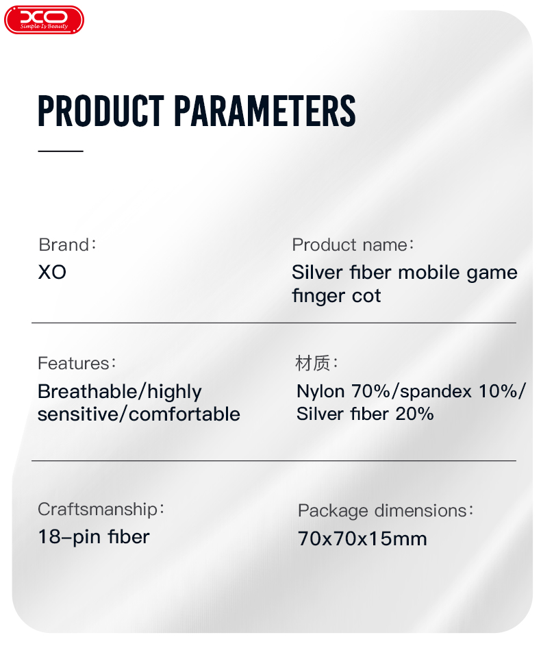 Μάρκα: ΧΟΌνομα προϊόντος:Silver fiber mobile game finger cotΧαρακτηριστικά: Αναπνεύσιμο/πολύ ευαίσθητο/άνετο/Νάιλον 70%/σπάντεξ 10%/Ασημένια ίνα 20%Χειροτεχνία: ίνα 18 ακίδωνΔιαστάσεις συσκευασίας: 70x70x15mm